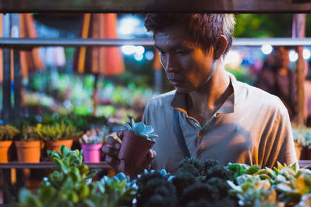 Young Asian man looks at a potted houseplant in his hands surrounded by shelves with indoor succulent plants at a night market. This is Chatuchak Plant Market, Bangkok City, Thailand.