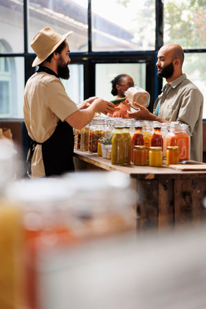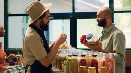 Male storekeeper in black apron hands over green vegetable to customer holding jar filled with organic food item. Salesman offering advice to client shopping for pantry staples at sustainable shop.