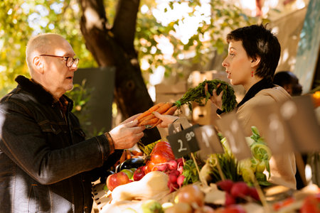 Young vendor giving freshly harvested organic carrots at farmers market stall booth. Elderly customer buying locally grown vegetables from female merchant at greenmarket stand.