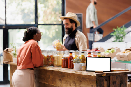 Horizontally positioned tablet with a blank chromakey mockup template near glass jars. While the shopkeeper speaks with the customer, a smart device on the counter displays an isolated white screen.