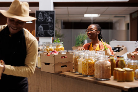 African American female client shops in eco friendly supermarket, discussing organic items with vendor. Black woman speaking with the shopkeeper while holding glass jars. Local, sustainable market.