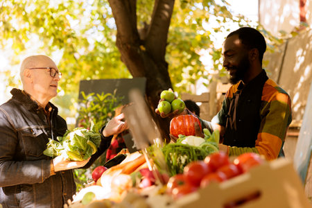 Senior male consumer shopping for natural organic products at local farmers market. Young african american man selling locally grown natural fruits and veggies to satisfied elderly customer.