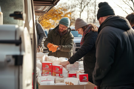 Community Volunteers Distributing Food Packages at Local Park During Crisp Autumn Morning