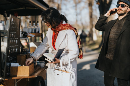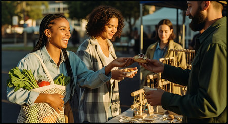 People buying sustainable clothes at street market, small business owner supporting ethical and slow fashion brands