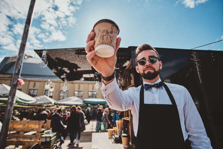 Groomed trendy barista in glasses has a coffee break and enjoying coffee. There are bright sunny summer day.