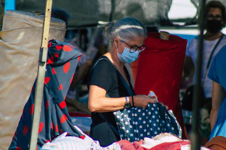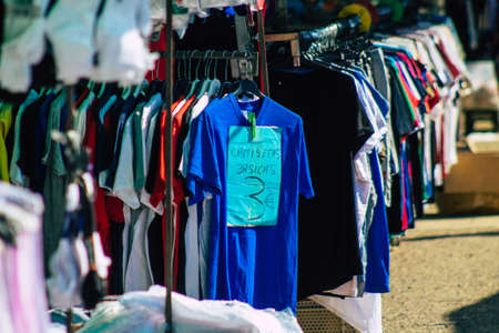 Carmona Spain July 19, 2021 Various summer clothes sold at the local market in downtown during Coronavirus outbreak hitting Spain, wearing a mask is mandatory