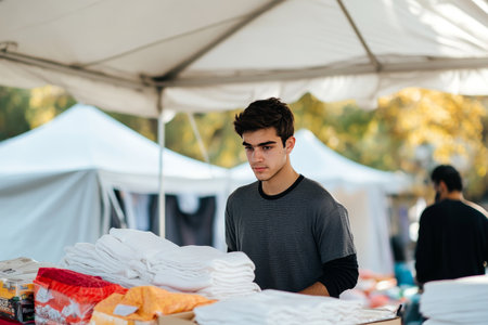 Low angle cinematic portrait of a vendor organizing used goods at a bustling community flea market u
