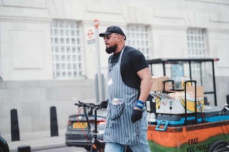 London, UK - March 9, 2019: People buying fruits and fresh juices from Juicebox stall on Oxford Street, London, in the evening. Oxford street is one of the most famous shopping streets in London.