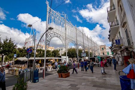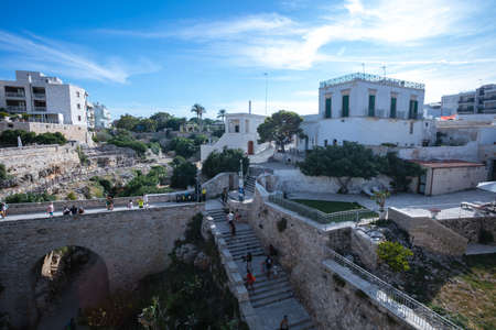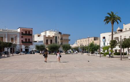 ITALY, POLIGNANO A MARE - OCTOBER 3: Polignano a Mare is a town located on the Adriatic Sea. People walking in center square of city on 3 October 2017, Polignano a Mare, Italy.