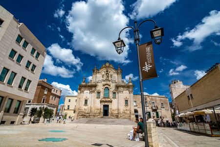 MATERA, ITALY - AUGUST 27, 2018: Summer day scenery street morning view from the amazing ancient town of the Sassi with white puffy clouds moving on the Italian blue sky, tourists enjoy weather