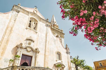 Taormina Sicily, Italy - July 9 2019: blooming pink flowers in front of defocussed church of St Joseph in the old town.