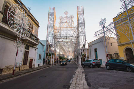 Diso, Apulio, Puglia, Italy - April, 22, 2018: Illuminations in the center of Diso, one of the most renowned pyrotechnic festivals in the South also takes place of Italy.