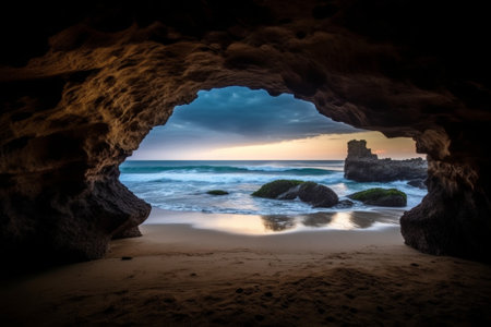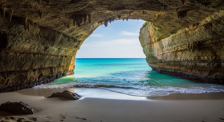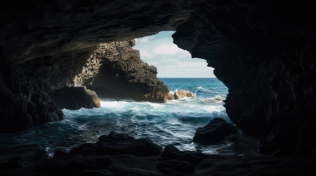 AI Generated. A breathtaking view of the ocean from inside a cave offering a serene perspective and a sense of confidence