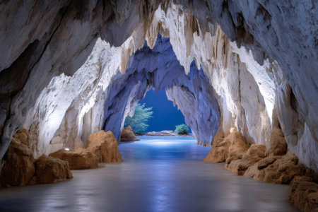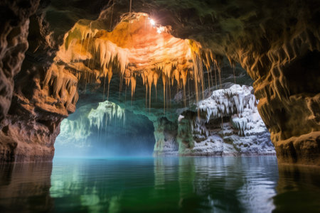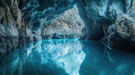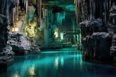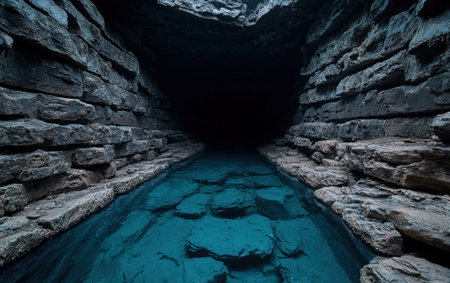 Underground river flowing through a dark cave with mysterious blue waters