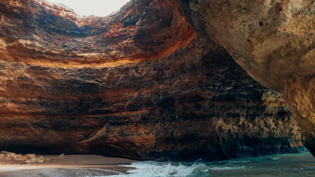 Waves gently wash along the sandy shore as sunlight filters through a natural archway in a rugged cave. Majestic cliffs rise in the background, creating a serene coastal scene.