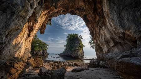 An image captures a cave entrance framing a view of an island surrounded by water. The composition showcases rocky textures and natural light illuminating the scene. This photograph could be used for various commercial or editorial purposes, conveying a sense of adventure and natural beauty. The sunlight creates dramatic highlights and shadows.