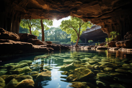 AI Generated. beautiful hidden cave with a small pool of water and a ray of sun entering in high resolution and quality