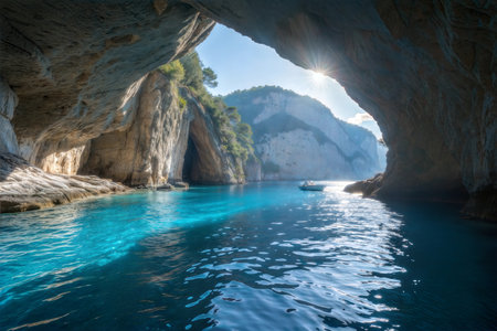 A boat floats in the crystal-clear water of a sunlit sea cave, surrounded by dramatic cliffs and lush greenery.