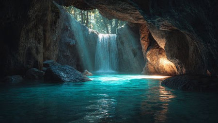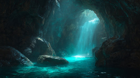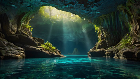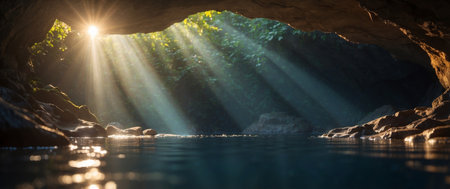 Sunlight streams through the opening of a cave, illuminating a pool of clear turquoise water. The scene is serene and magical with reflections on the water and beautiful rock formations.