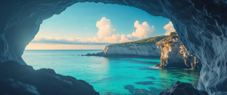 AI Generated. Scenic View from Cave Opening Overlooking Turquoise Sea and Rocky Coastline Under Clear Blue Sky