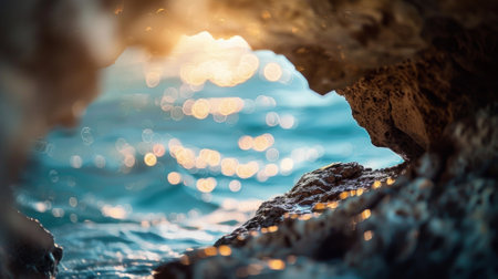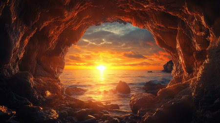 Discover a breathtaking coastal scene featuring a stunning cave opening with golden sunrise rays illuminating gentle waves, creating a serene atmosphere.