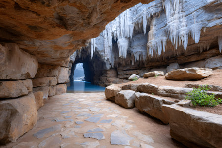 hot spring in a cave with stalactites overhead, created with generative ai