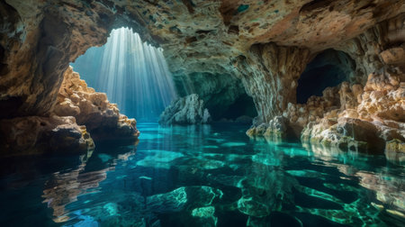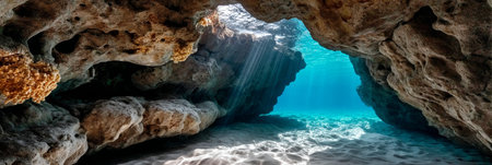 Breathtaking Underwater Cave with Sunbeams Piercing Through Clear Waters and Vibrant Reef Walls