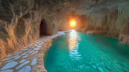 Beautiful sunset illuminating a serene cave with turquoise water and a winding walkway
