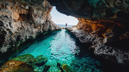 A lone hiker stands inside a large ocean cave, with rugged rock formations and turquoise water creating a sense of adventure.