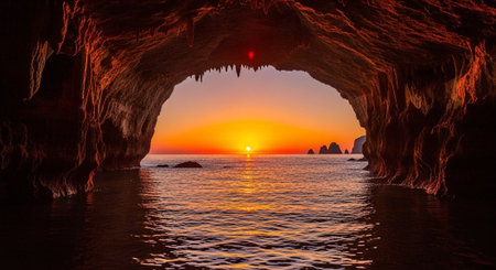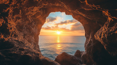 A stunning sunset illuminates the sky from inside a rocky cave at the beach. Gentle waves ripple over clear waters as the sun sets, creating a peaceful atmosphere.