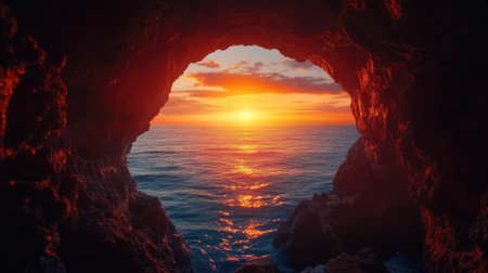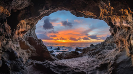 A cave opening frames the ocean horizon during a vibrant sunset. The composition features warm colors, with a mix of orange, yellow, and purple hues across the sky. The rugged texture of the cave contrasts with the smooth surface of the water. Suitable for various editorial and commercial applications.