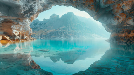 A stunning view of a crystal-clear turquoise lake inside a cave, with majestic mountains visible in the distance and calm waters reflecting the scene.