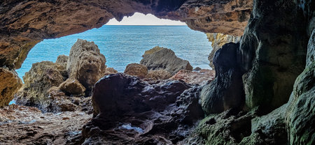 Inside view of the grotto to the sea. Dark cave in the mountains. Big stones. Black Sea