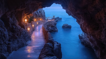 Explore a serene coastal cave pathway lined with glowing lanterns that illuminate the tranquil waters. A perfect escape into natural beauty and mystery.