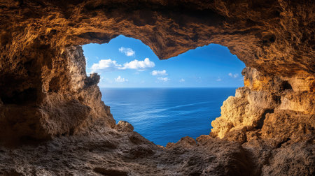 This stunning image captures a breathtaking view from inside a cave, showcasing a tranquil ocean under a bright blue sky, perfect for nature enthusiasts and travel themes.