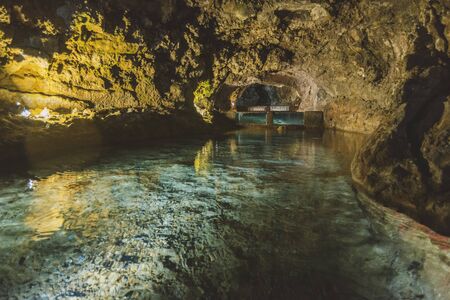 artificial light reflections in underground lake inside volcanic cave from Madeira Island
