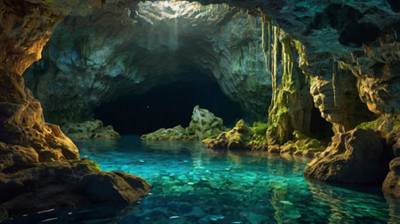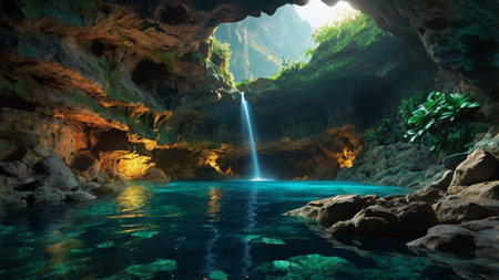 An AI generated illustration of blue lagoon in a green cave
