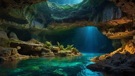 underwater cave with view of the surface, sunlight filtering through the water, created with generative ai