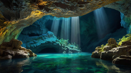 Inside a cave with sunlight shining through the water. 3d rendering