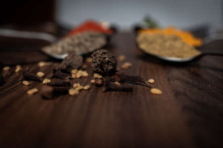 Indian Garam masala powder in bowl and it's ingredients colourful spices. Served over moody background. selective focus