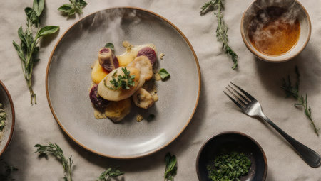 An overhead shot of a delicious fine dining meal on a ceramic plate. The dish is steaming hot and garnished with fresh herbs, set on a rustic table with sauces and a fork.