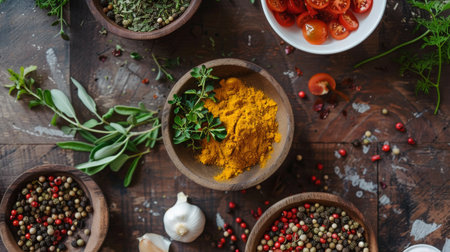 A variety of spices and herbs in wooden bowls arranged on a rustic table. The colorful display includes peppercorns, turmeric, and garlic, perfect for cooking, culinary, and food themes.