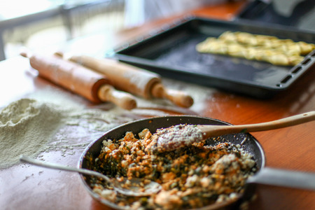 Selective focus on the hands of a food blogger, holding smartphone in live view mode, and taking photo of dumplings on the wooden board, for the blogging content. Ukrainian national dish Varenyky