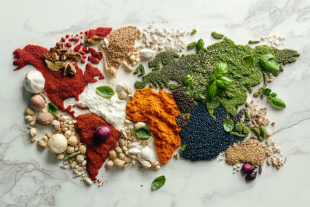 A creative representation of a world map crafted from various spices and herbs highlights different regions with unique colors and textures, illustrating culinary diversity and global flavors.