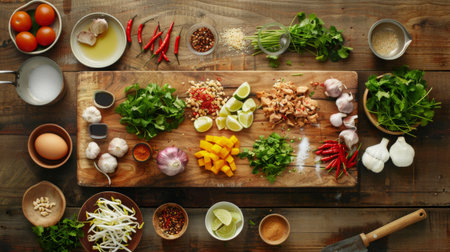 A Thai kitchen scene with ingredients for curry stir-fry laid out on a wooden cutting board, inviting culinary creativity