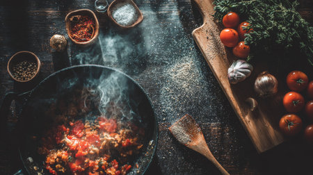 A beautifully arranged rustic kitchen scene showcases a steaming pan filled with vibrant ingredients, rustic utensils, and fresh herbs, evoking culinary creativity.
