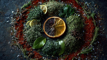 A stunning circular arrangement of dried herbs, spices, and citrus, showcasing vibrant colors and textures, ideal for culinary inspiration and food styling projects.