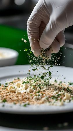 In a close up food shot, a hand in a white glove sprinkles herbs over a plate of crumbled cheese and toasted breadcrumbs, enhancing the visual appeal of the dish.