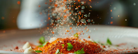 A close-up of a spice blend being sprinkled over a dish, with colorful spices arranged around it. The rich colors and fine textures of the spices enhance the dish, creating an appetizing and aromatic scene.
