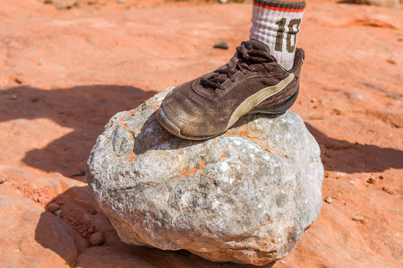 Human legs stand on man-made stone pile on mountain top close-up. View from above to tour on mountain peak. Background of combe rocky hill with man legs. Travel in highlands. Tourism on high altitude.